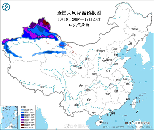 중앙기상청은 1월 10일 18시에 한파청색주의보를 발령했다. 랭공기 영향으로 1월 11일부터 15일까지 한파가 서쪽에서 동쪽으로 우리 나라 대부분 지역에 영향을 줄 것으로 예상되며 그중 11일부터 12일까지 주요하게 사북지역, 12월 밤부터 15일까지 우리 나라 중동부 지역에 영향을 줄 것으로 예상된다. 우리 나라 대부분 지역의 기온은 8-12℃ 폭락하고 그중 신강 북부, 감숙 북부, 내몽골 중동부, 동북 지역, 강한 동부, 강회, 강남, 화남 북부, 귀주 등 지역은 기온이14~18℃ 내려가며 신강 북부, 길림 중동부, 흑룡강 등 부분 지역은 기온이 20℃ 넘게 떨어지고 4~6급의 돌풍, 6~8급의 큰 바람이 동반되며 신강 산어구 풍력은 8~10급에 달할 것으로 예측된다. 기온이 하락한 후 17일 아침, 최저기온 0℃ 선은 남으로 운남 동부에서 귀주 남부, 호남 남부, 복건 북부, 절강 동부까지 내려온다.
