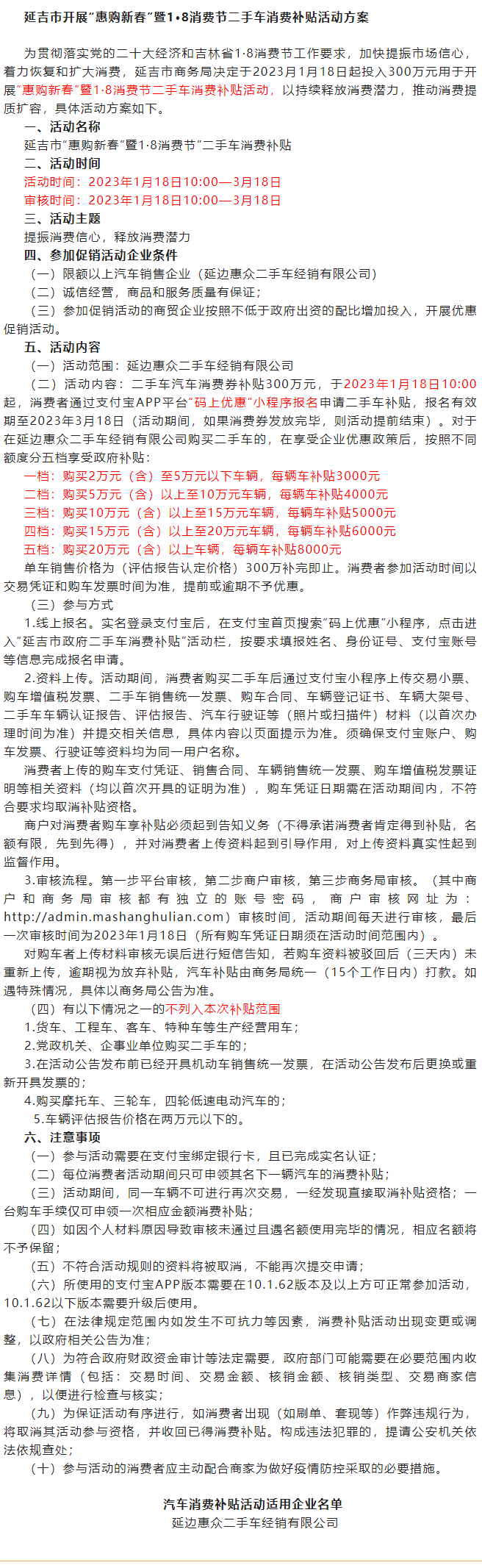 20차 당대회 경제 관철 시달 및 길림성 1·8소비절 사업요구에 따라 연길시상무국은 2023년 1월 18일부터 300만원을 투입하여 중고차소비 보조금활동에 사용하기로 했다. 구체 활동방안은 다음과 같다.