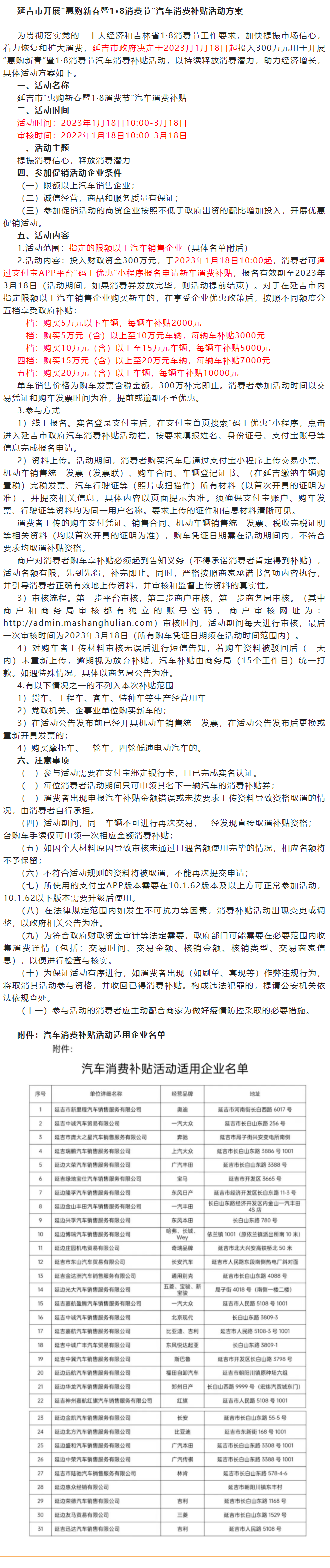 20차 당대회 경제 관철 시달 및 길림성 1·8소비절 사업요구에 따라 연길시상무국은 2023년 1월 18일부터 300만원을 투입하여 자동차소비 보조금활동에 사용하기로 했다. 구체 활동방안은 다음과 같다.