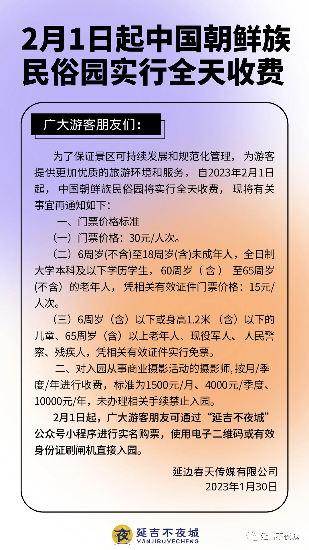 풍경구의 지속가능한 발전과 규범화 관리를 보장하고 관광객들에게 더욱 좋은 관광환경과 봉사를 제공하고저 2023년 2월 1일부터 중국조선족민속원은 유료 입장제를 실시하게 된다. 관련 사항을 아래와 같이 통지한다.