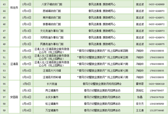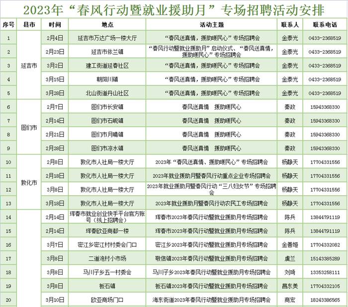 주인력자원및사회보장국에 따르면 우리 주 8개 현시는 3월말까지 도합 59차례의 "봄바람행동 및 취업원조월" 특별초빙활동을 전개하게 된다. 2023년 '봄바람행동 및 취업원조월" 특별초빙활동은 전 주 농촌로동력, 취업곤난인원, 대학졸업생 및 고용단위의 취업과 고용 수요를 해결하는 데 주력하게 된다. 초빙활동은 3월말까지 진행될 예정이다. 지금까지 이미 온라인과 오프라인으로 23차례 초빙활동이 전개됐는데 초빙정보 3,800여건을 발표하고 장춘시와의 로무협력관계를 유지했으며 기업 58개와 취업곤난인원 257명을 방문하고 취업곤난인원 81명을 취직시켜주었다.