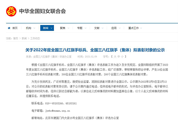 <전국3.8붉은기수 모범, 전국3.8붉은기수(집체) 선정 및 표창사업 방법> 및 보충 규정에 따라 일전에 중화전국부녀련합회는 2022년 전국3.8붉은기수 모범, 전국3.8붉은기수(집체) 선정 및 표창사업을 조직전개하였다. 광범위한 추천, 심사심의와 종합평가를 거쳐 전국 3.8붉은기수 모범 표창 대상자 10명, 전국3.8붉은기수 표창 대상자 300명, 전국3.8붉은기집체 표창 대상 200개가 탄생했다.
