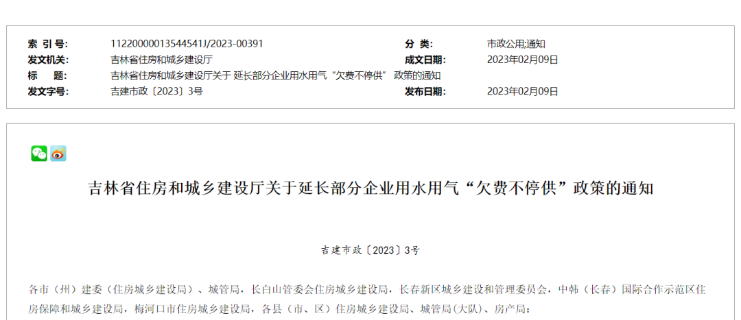 2월 9일, 길림성주택및도시농촌건설청은 길림성에서 '비용을 미납하여도 공급을 중지하지 않는' 정책 기한을 계속해 연장한다는 통지를 발부했다. 전염병의 영향으로비용을 제때에 납부하지 못한 령세기업, 개체공상호와 양로위탁양육봉사기구의 물사용, 가스사용에 대해 '비용을 미납하여도 공급을 중지하지 않는' 정책을 실행하는데 납부유예기한은 2023년 3월 31일까지이며 납부유예기간 체납금을 면제한다.