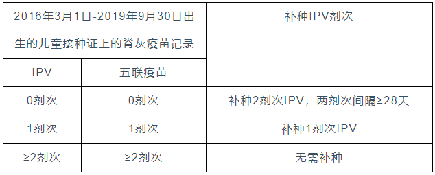 2016년 3월 1일-2017년 12월 31일에 출생한 아동, 그리고 IPV 성분 백신접종사가 ≤1차례일 경우 IPV를 보충접종해야 한다. 만약 아이가 2018년 1월 1일-2019년 9월 30일에 출생하고 전에 보충접종을 완성하지 못했을 경우에도 이번 단계에 보충접종을 진행할 수 있다.