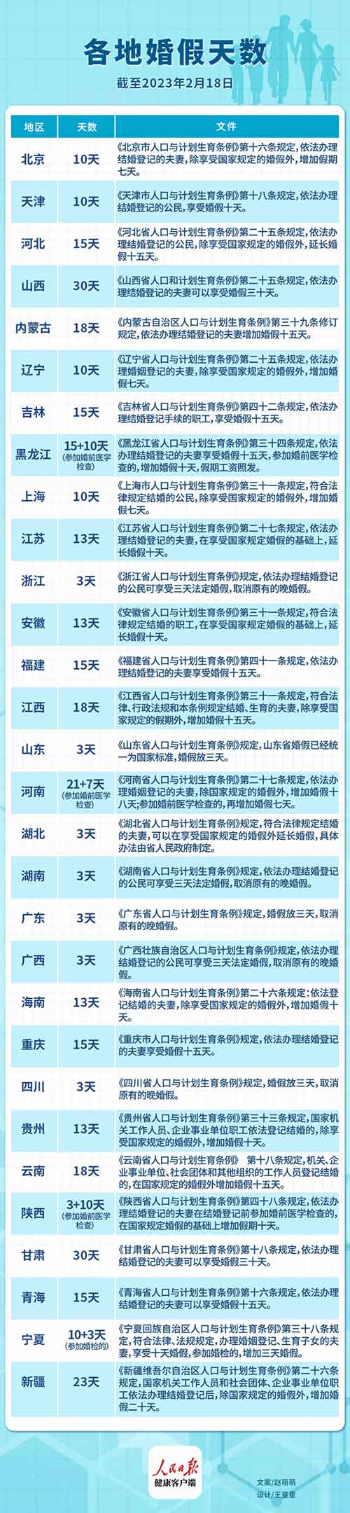여러 지역에서는 인구와 계획출산 조례를 개정할 때 결혼휴가도 함께 조정했다. 불완전통계에 따르면 현재 사천 성도, 강소 남경, 천진, 안휘, 강서 등 지역은 결혼휴가를 연장했는데 그중 감숙, 산서 두 성의 결혼휴가는 최장 30일에 달한다.