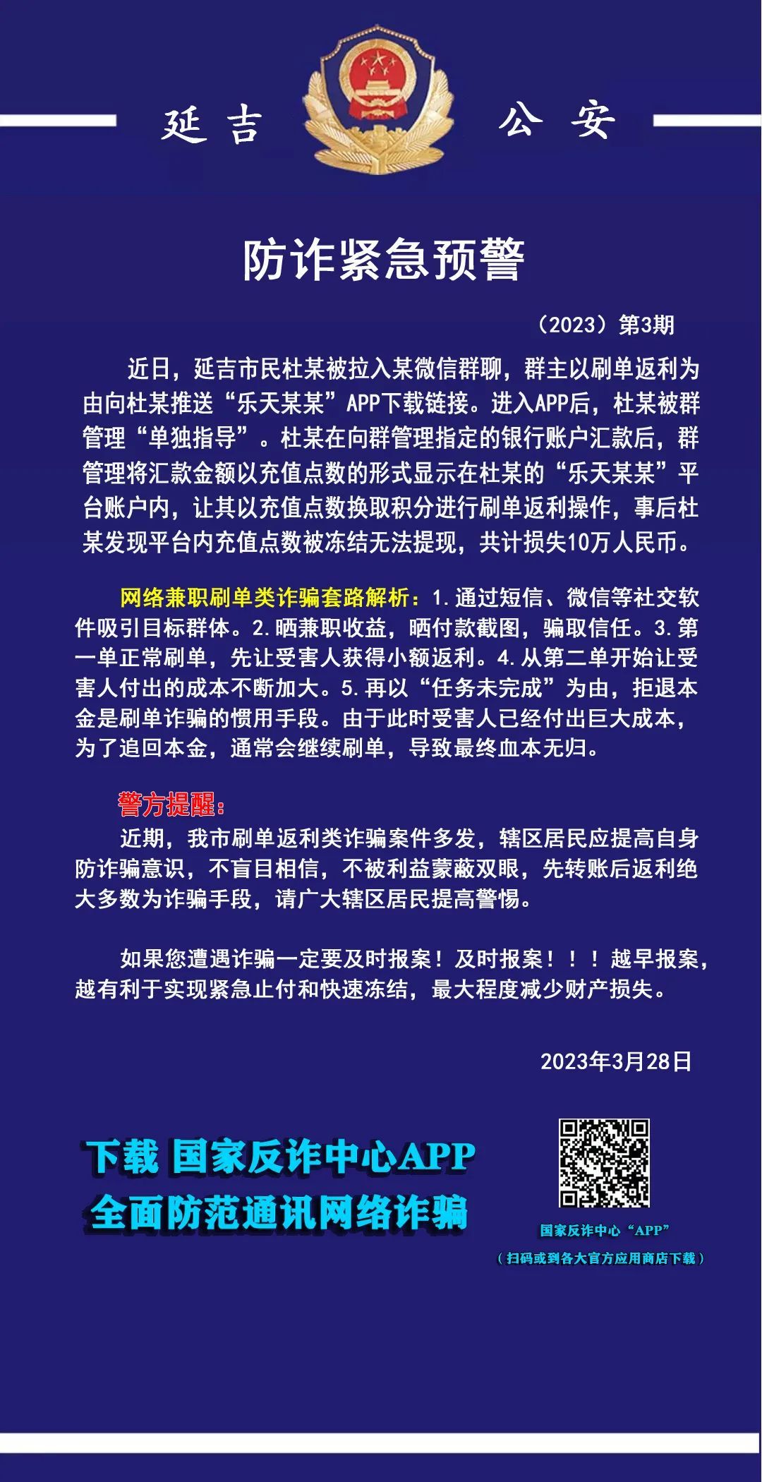 최근, 연길시에 허위주문류 사기사건이 많이 발생했으므로 관할구역 주민들은 자신의 사기방지의식을 높이고 맹신하지 않으며 리익에 눈이 멀지 않도록 해야 한다. 먼저 계좌이체를 요구하는 것은 대부분 사기수단이므로 광범한 관할구역 주민들은 반드시 경각성을 높여야 한다.