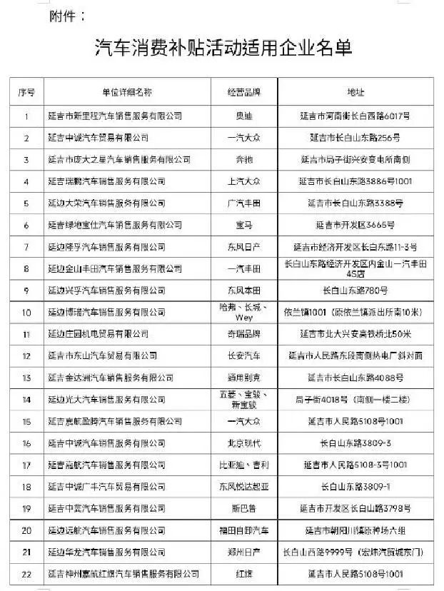 이번 새차소비 보조활동의 지정 한도 이상의 자동차판매기업은 도합 31곳이다. 활동기간 소비자는 기업 우대정책을 향수받은 후 부동한 한도에 따라 다섯개 등급으로 나뉘여 정부보조를 향수받을 수 있다.