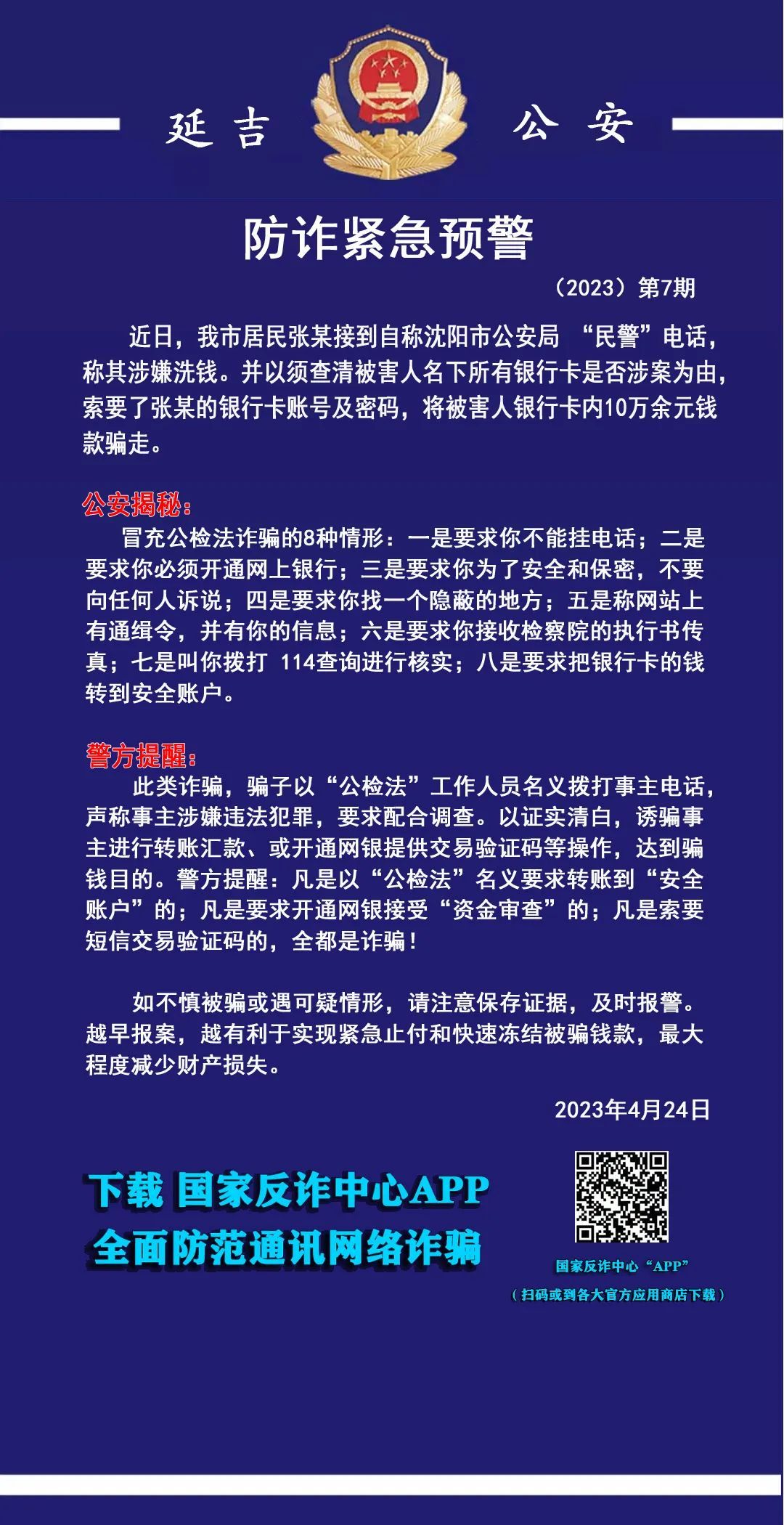 일전, 연길시 주민 장모는 심양시공안국 '민경'으로 자칭하는 사람으로부터 장모가 돈세탁 혐의가 있다는 전화를 받았다. '민경'은 피해자 명의하의 모든 은행카드가 사건에 련루되였는지 여부를 조사해야 한다는 리유로 장모의 은행카드 계좌번호와 비밀번호를 요구해 은행카드에서 자금 10만원을 사기쳤다.