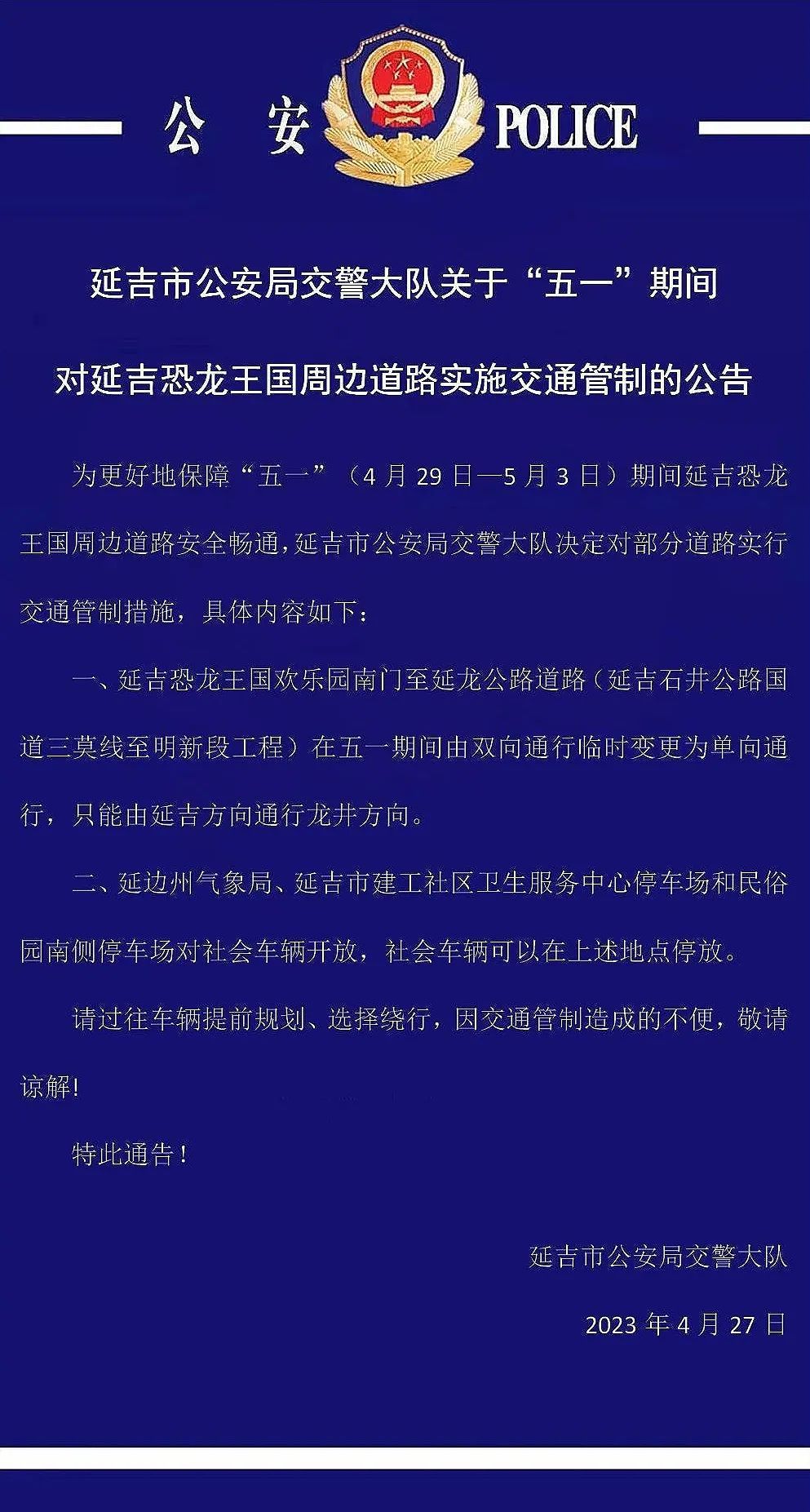 '5.1'절 기간 연길공룡왕국 주변 도로에 대해 교통관리통제를 실시할 데 관한 연길시공안국 교통경찰대대 공고
