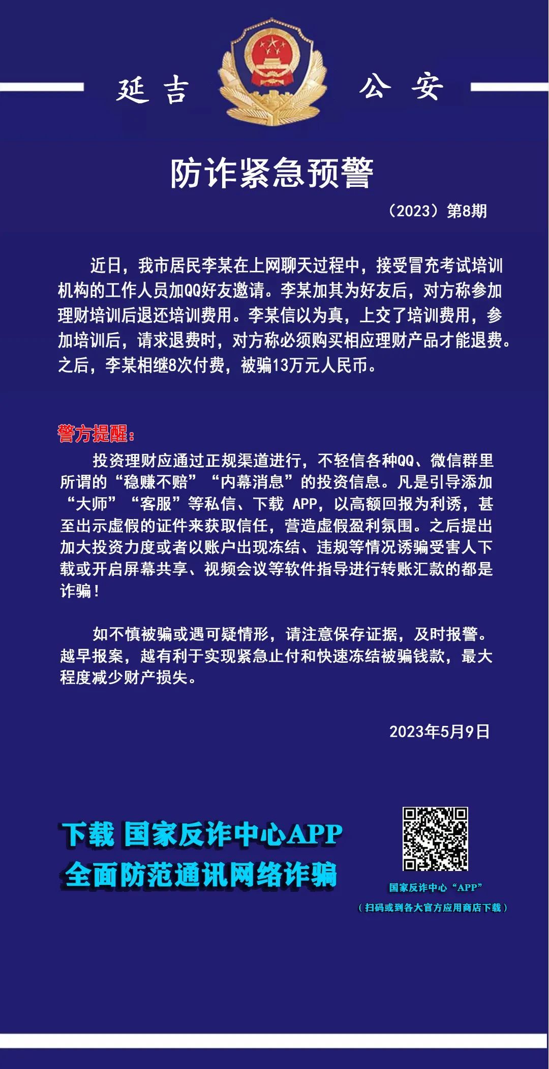 재테크 투자는 응당 정규적인 경로를 통해 진행해야 한다. 각종 QQ, 위챗 그룹에서 말하는 '안정하게 벌고 손해를 보지 않는' '내부정보' 의 투자정보를 쉽게 믿지 말아야 한다. 무릇 '대가' '고객서비스' 등을 추가하도록 인도하는 개인 메시지와 APP를 다운받게 하여 고액의 수익을 미끼로 하거나 심지어는 허위 증명서를 제출해 신임을 얻고 허위 수익 분위기를 만든 후 투자를 확대하게 하거나 계좌가 동결, 규정위반했다는 등 정황이 나타났다면서 피해자더러 스크린 공유, 영상회의 등 소프트웨어를 다운받게 하거나 열게 하고 계좌이체하도록 지도하는 것은 모두 사기이다.