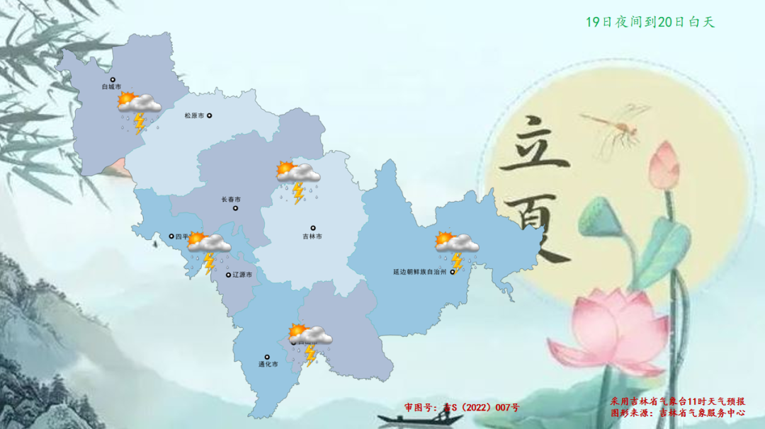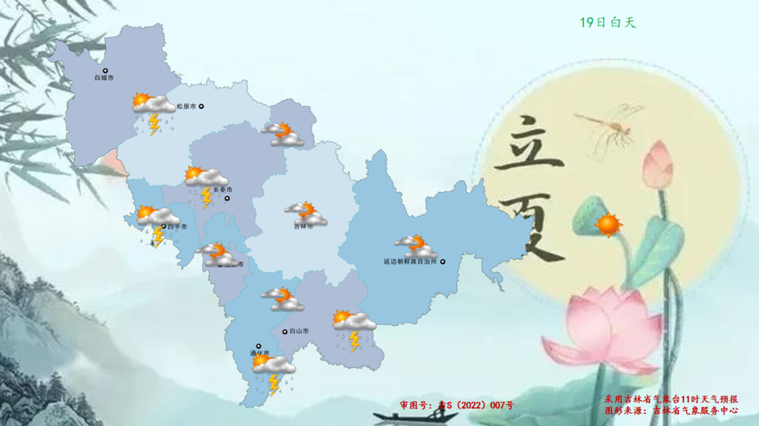 19일 낮, 전 성은 구름이 많겠으며 백성, 송원, 장춘 서부, 사평 서부, 통화 동남부, 백산 동부와 남부, 장백산보호구에 소나기가 내리겠다.