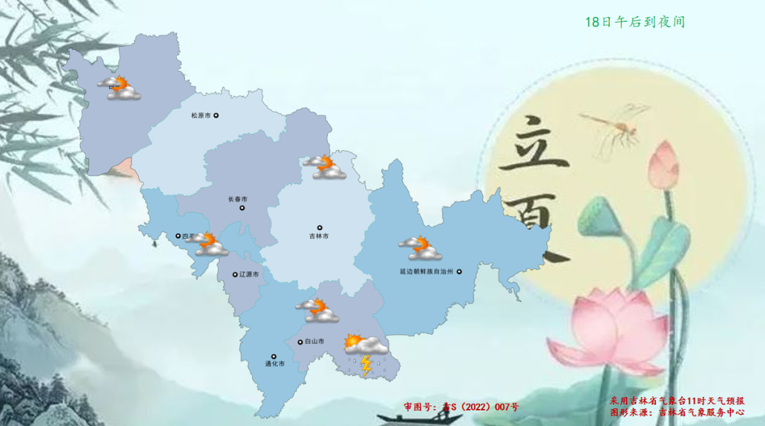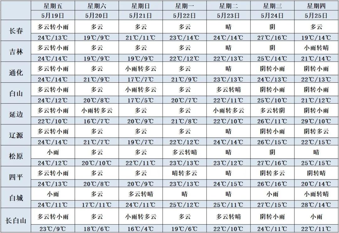 18일 밤, 길림성 중동부 지역의 최저기온은 7~10℃이고 기타 지역은 11~12℃일 것으로 예상되며 19일 낮, 길림성 대부분 지역의 최고기온은 22~25℃일 것으로 보인다.