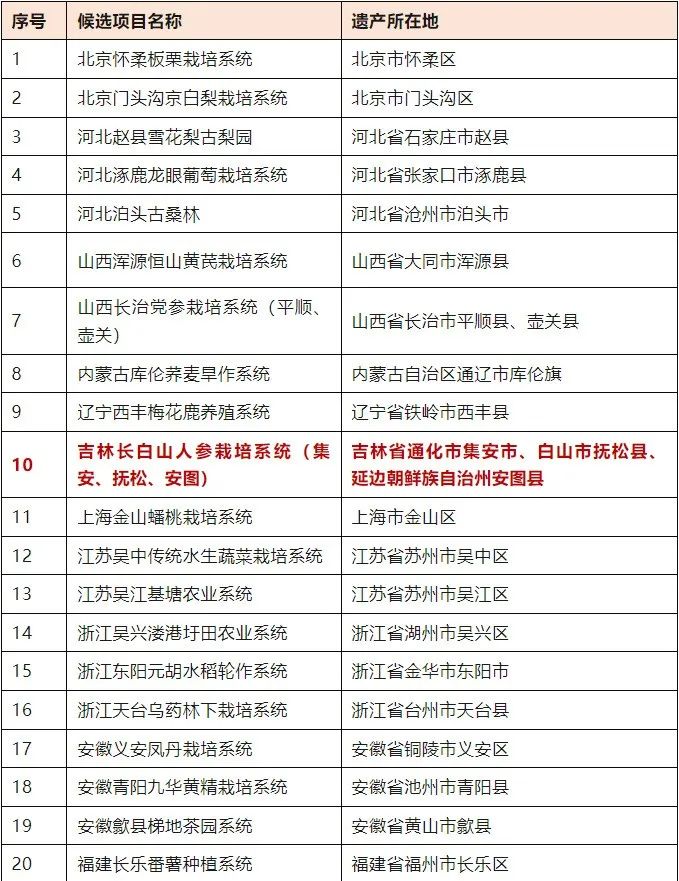 일전, 농업농촌부는 제7진 중국중요농업문화유산 후보대상 명단을 공시했다. 그중 길림장백산인삼재배계통(집안, 무송, 안도)이 후보명단에 이름을 올렸다.