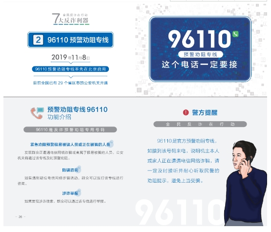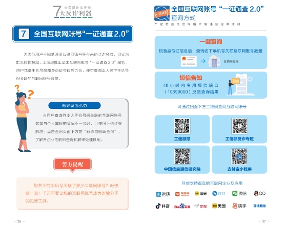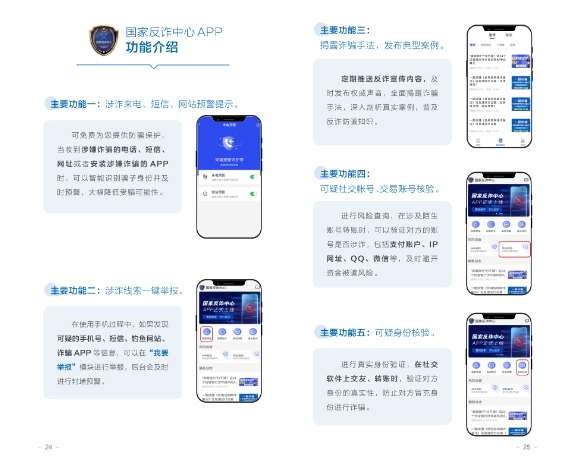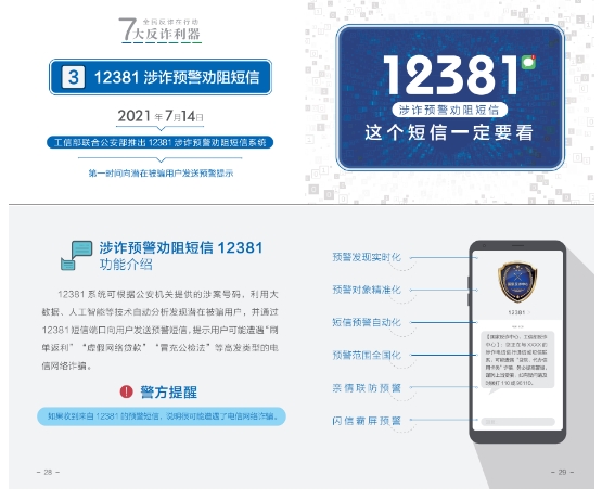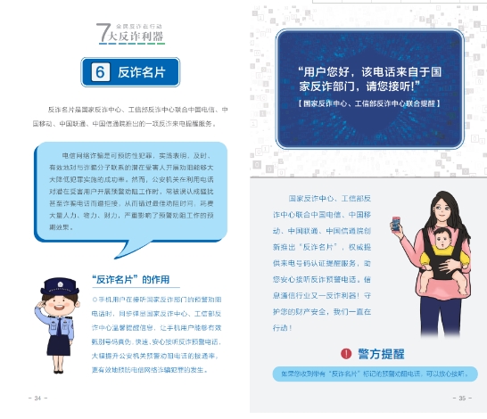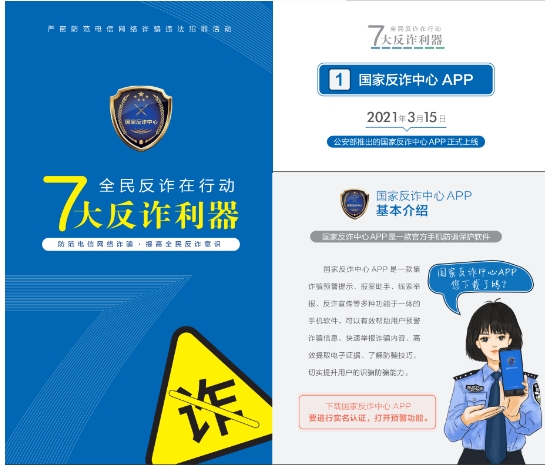 <수첩>은 지난 2년 동안 공안부와 공업정보화부, 중국인민은행이 공동으로 출시한 7대 사기방지도구인 국가사기방지센터 APP, 96110 조기경보 차단 열선 및 12381 사기 조기경보 및 문자차단 시스템, 국가 휴대전화카드 '원클릭 검사', 클라우드 플래시 앱 '원클릭 검사카드', 사기 명함, 국가 인터넷계정 '원클릭 검사 2.0'의 주요기능과 다운로드 조회방법을 자세히 소개했고 광범위한 대중들이 많이 다운받고 사용하여 공동으로 전신사기방지의 ‘방화벽’을 구축하도록 격려했다.