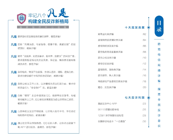 중앙선전부와 공안부가 공동으로 전개한 '전국민 사기방지행동'의 월별 홍보활동 관련 요구사항에 따라 국가사기방지센터는 <2023년판 전신통신망 사기예방 홍보수첩>을 편찬, 제작하여 출시했고 10가지 류형의 흔한 인터넷사기사건의 특징과 사기수법을 상세하게 분류했으며 7대 사기방지도구의 주요기능과 사용방법을 심도 깊게 소개하고 사기방지선전의 범위를 더욱 확대하고 대중의 인식을 확대하고 사기방지의식과 능력을 향상시킨다.