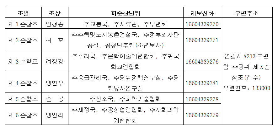 순찰사업에 대한 주당위의 통일 배치에 따라 주당위 6개 순찰조가 2023년 6월 15일부터 8월 25일까지 주신소국 등 17개 주 직속 부문에 대한 순찰을 펼치게 된다. 사업직책에 따라 주당위 순찰조는 주로 피순찰단위 지도소조 성원 및 기타 주 관할 간부, 하급 단위 주요 책임자의 문제애 대한 제보를 접수하며 정치 규률, 중앙 8가지 규정 정신, 조직 규률, 렴정 규률, 대중 규률, 사업 규률, 생활 규률을 위반한 두드러진 문제에 대한 제보를 중점적으로 접수한다. 순찰조 수리 범위에 포함되지 않는 기타 문제에 대한 제보는 규정에 따라 관련 부문에 전달해 처리한다. 광범한 간부, 대중들이 문제를 적극적으로 반영해주기 바란다. 신소 접수 시간은 2023년 6월 15일부터 8월 18일까지이다.