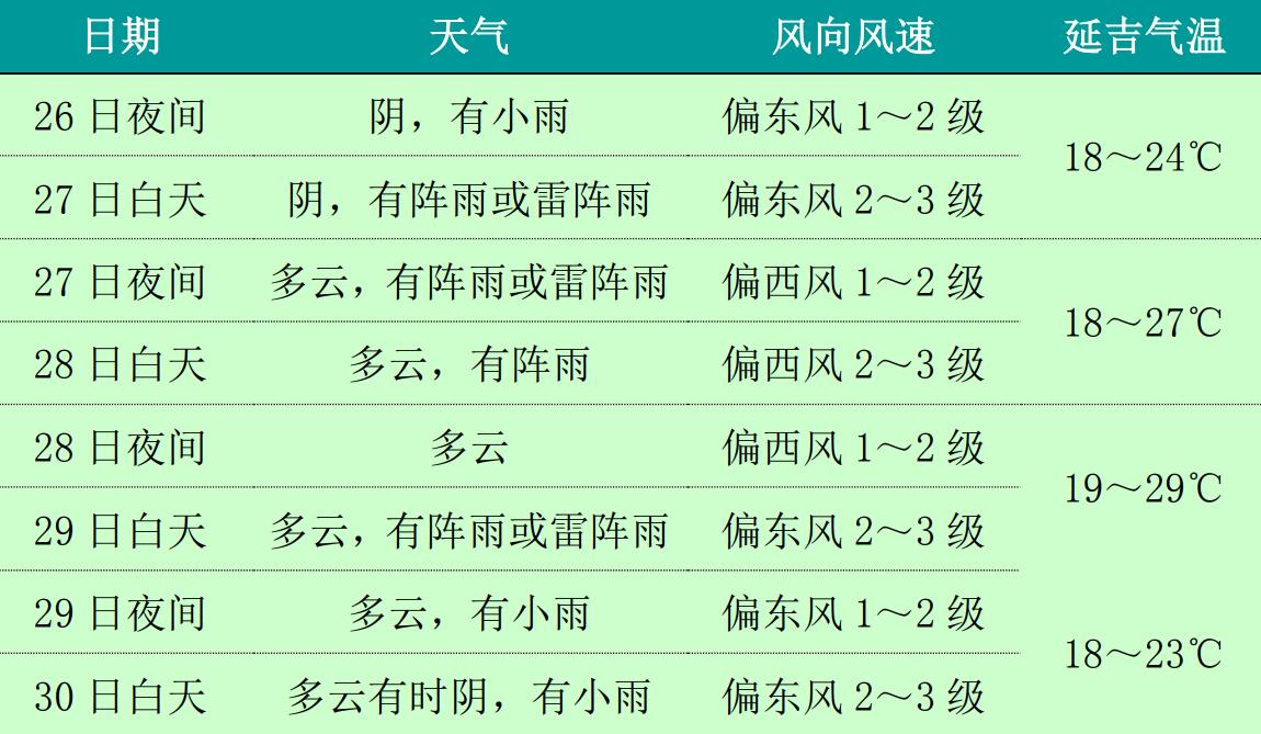 고중입시기간(6월27일-30일) 우리 주 기온은 다소 높고 강수가 다소 많을 것으로 예상된다. 전 주 평균기온은 21.0℃ 안팎으로 평년 동기보다 1.6℃ 가량 높겠고 기온은 기복이 비교적 크겠으며 전 주 평균강수량은 15~25밀리메터로 평년 동기보다 7밀리메터 가량 많겠다. 이 기간, 우리 주에는 여러차례 강수가 있겠고 부분적 지역에는 천둥 번개, 우박, 단시간내 강수 등 강대류날씨가 나타나겠으며 풍력은 크지 않을 전망이다.
