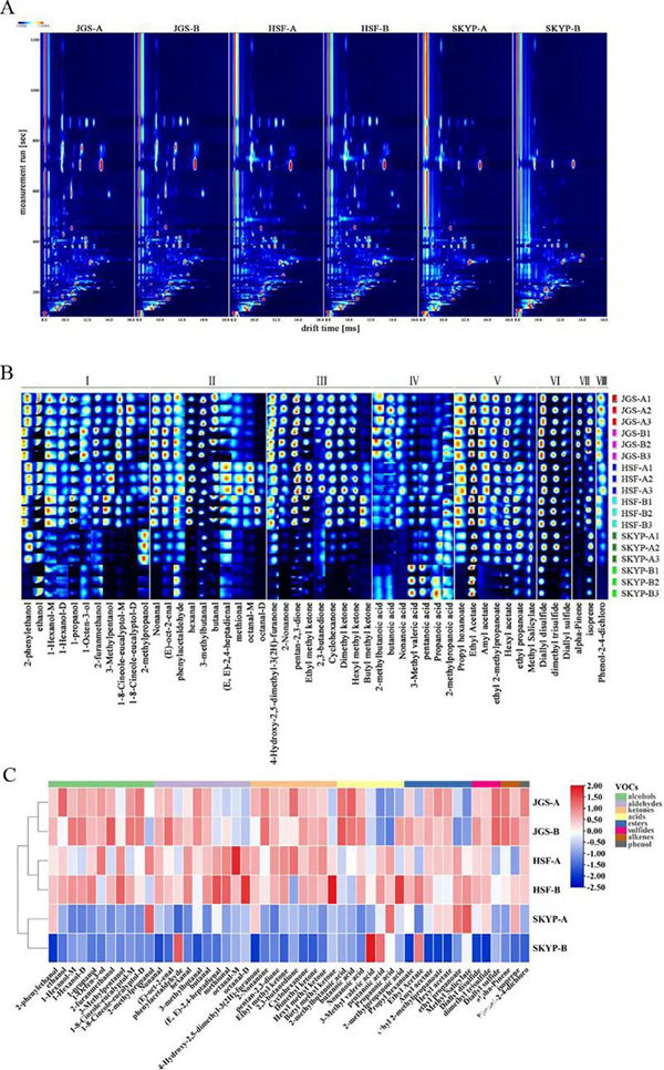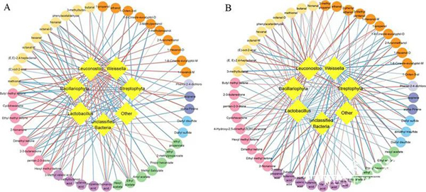 본 연구에서는 헤드스페이스-가스 크로마토그래피-이온이동도분광법(HS-GC-IMS), 고처리량 시퀀싱 및 Spearman 상관성 분석을 사용하여 4°C에서 1주일 동안 보관한 3가지 김치의 풍미 물질과 균종의 변화특징을 연구했다. 결과 3가지 김치에서 총 50가지 휘발성 유기화합물이 확인되였고 보관과정에서 대부분의 알콜류, 알데히드류와 케톤류, 에스테르류 물질이 줄어든 반면 산은 증가되였으며 류화물, 알켄 및 페놀은 비교적 평균적이였다. 3가지 김치에서 후벽균문(Firmicutes), 시아노박테리아(Cyanobacteria), 프로테오박테리아(Proteobacteria)의 3가지 우세균문과 와이셀라(Weissella), 스트렙토피타(Streptophyta), 류코노스톡(Leuconostoc), 바실리오피타(Bacillariophyta), 락토바실러스(Lactobacillus) 등 5가지 우세균속이 확인되였다. Spearman의 상관계수는 Leuconostoc, Lactobacillus 및 Weissella가 김치에서 풍미를 형성하는 주요 균속이고 Bacillariophyta 및 Streptophyta는 김치의 저장되는 과정에서 풍미를 형성하는 주요 균속임을 나타냈다. 이 연구결과는 김치를 저장하는 과정의 미생물의 풍미형성효과를 더욱 잘 료해하는 데 도움이 된다.