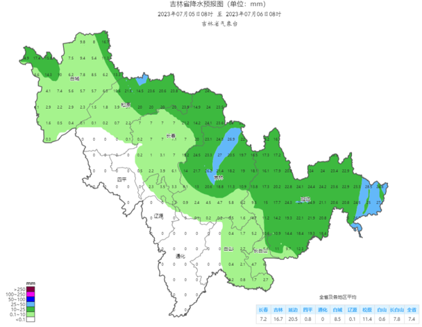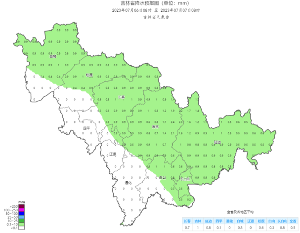 향후 24시간, 백성 대부분 지역, 송원 대부분 지역, 장춘 서부, 사평, 료원, 통화 대부분 지역에 큰비 또는 폭우가 내리겠으며 부분적 지역에 큰 폭우가 내릴 것으로 보인다. 이에 응급관리국, 성기상국은 련합으로 예방사업에 주의돌릴 것을 권고했다.