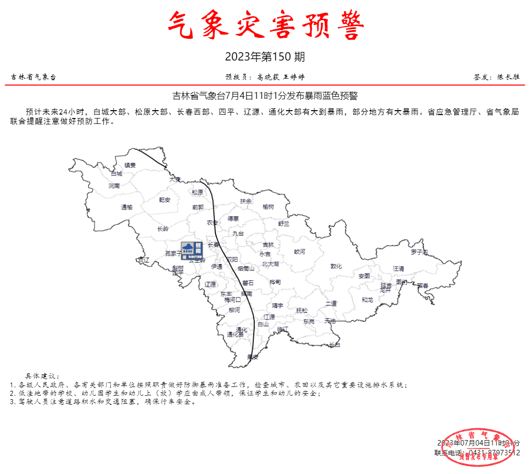 길림성기상대는 7월 4일 11시 1분에 폭우 람색 조기경보를 발부했다.