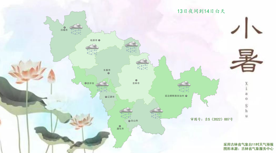 13일 밤부터 14일 낮까지, 길림성은 구름이 많고 이따금 흐리겠으며 백성, 송원, 장춘 북부, 길림 북부에는 큰비, 부분적 지역에는 폭우가 내리겠고 단시간 강수, 천둥, 강풍, 우박 등 강대류 날씨가 동반되겠으며 기타 지역에는 중등정도의 비 또는 큰비가 내릴 것으로 예상된다.