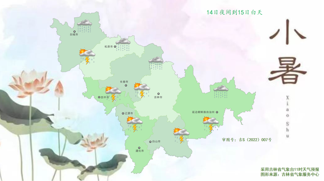 14일 밤부터 15일 낮까지, 길림성은 구름이 많고 이따금 흐리겠으며 백성 북부, 송원 북부, 장춘 북부, 길림 북부, 연변 북부에는 중등정도의 비, 부분적 지역에는 큰비, 기타 지역에는 소나기가 내릴 것으로 예상된다.