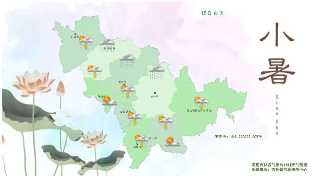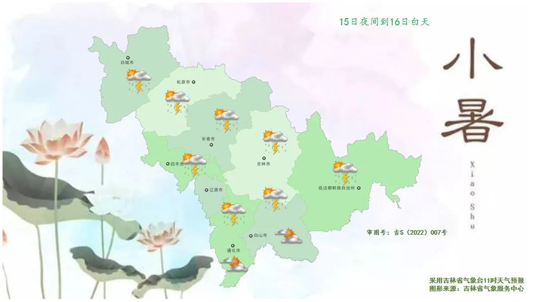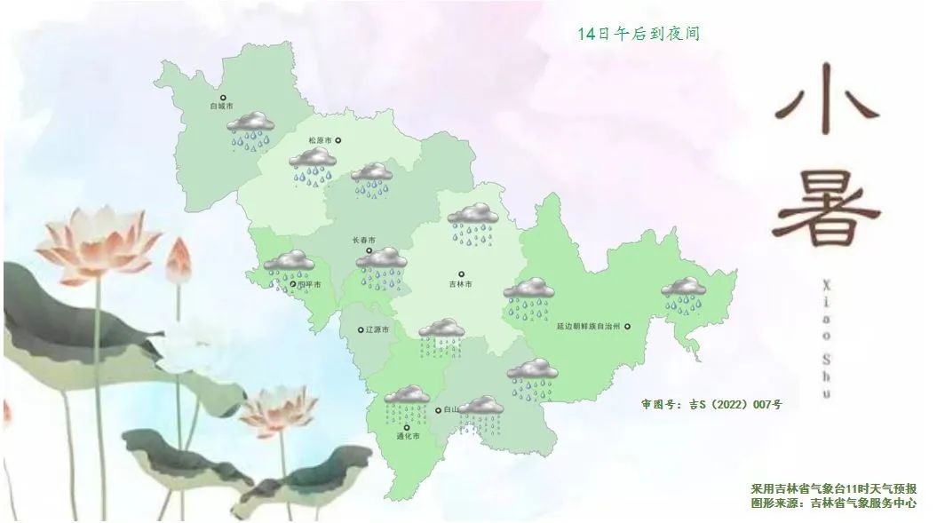 래일 낮, 길림성은 구름이 많다가 때론 흐리겠으며 송원 북부, 장춘 북부, 길림 북부에는 중등 정도의 비가 내리겠고 부분적 지역에는 큰비가 내림과 아울러 단시간내 강수, 천둥 번개, 강풍, 우박 등 강대류날씨가 동반되겠으며 백성, 송원 남부, 장춘 남부, 료원 동부, 길림 남부, 통화, 백산 서부와 북부, 연변, 장백산보호구에는 소나기 혹은 천둥 번개를 동반한 소나기가 내리겠다.