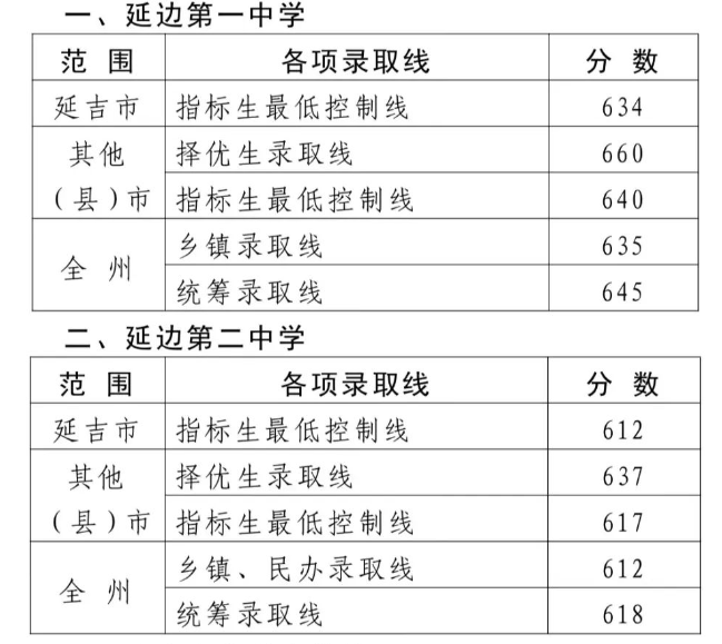 연변2중의 학생모집 점수선은 연길시 지표생 최저통제 점수선이 612점이고 기타 현, 시는 우수생 점수선이 637점, 지표생 최저통제 점수선이 617점이며 향진, 민영학교 수험생 점수선은 612점이고 统筹 모집 점수선은 618점이다.
