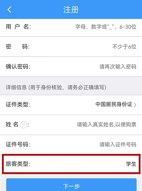 2.철도12306 사이트, 철도12306 어플을 통해 학생표를 구매하고 탑승자를 추가할 때 혜택류형을 ‘학생’으로 선택하거나 혹은 사용자등록시 승객류형을 ‘학생’으로 선택한다.