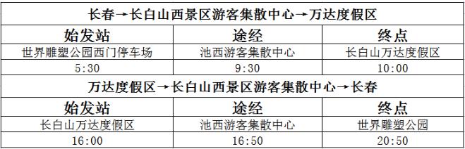 관광객들에게 출행 편리를 제공하기 위해 7월 28일 5시 30분, 장춘-장백산 지서관광객터미널 아침뻐스와 16시 50분의 장백산 지서관광객터미널-장춘 저녁뻐스를 증차하게 되며 장백산 당일치기 려행꿈을 실현할 수 있게 되였다.
