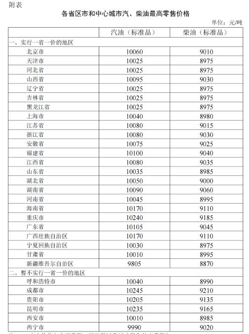 최근 국제시장 유가변화 상황에 근거한 현행 완제품유 가격형성메커니즘에 따르면 2023년 8월 9일 24시부터 국내 휘발유, 디젤유 가격(표준품, 이하 동일)이 톤당 240원, 230원 인상되였다. 조정후 각 성(자치구, 직할시) 및 중심 도시의 휘발유 및 디젤유 최고 소매가격은 부록표와 같다. 관련 가격련동 및 보조금정책은 현행 규정에 따라 시행된다.