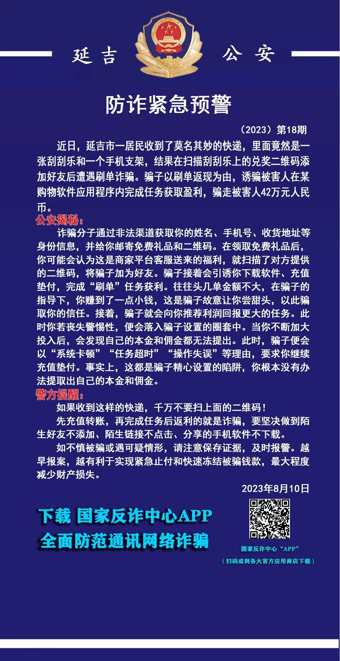 최근, 연길시의 한 주민은 복권 한장과 휴대전화 거치대가 들어 있는 엉뚱한 택배를 받았다. 이에 그는 아무 생각없이 복권 우에 표시된 큐알코드를 스캔해 친구를 추가했는데 결국 허위주문 사기를 당하게 되였다. 사기군은 피해자가 모쇼핑소프트웨어 응용프로그램에서 허위구매 임무를 완성하여 리익을 얻도록 유도해 피해자한테서 42만원을 사취했다.
