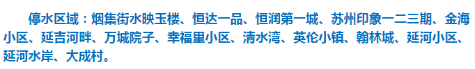 이번 단수는 생산 및 생활 용수에 직접적인 영향을 미치므로 단수구역의 시민, 기업, 사업단위에서는 미리 물을 받아둘 준비를 하기 바랍니다. 물공급 회복기간, 압력 불안정과 수질 혼탁현상이 발생할 수 있는데 적정량의 물을 방류하면 인차 정상적으로 사용할 수 있습니다. 도관망 말단구역과 높은 지대 사용호는 물공급 회복시간이 다소 지연될 수 있습니다.
