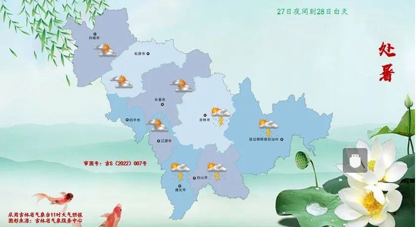 향후 24시간 길림성 서북부, 중동부에는 천둥번개 날씨가 나타나겠는데 그중 동부 산간지역에는 단시간내 강한 강수가 내리겠다. 주요 영향시간대는 오늘 오후부터 초저녁까지이다.