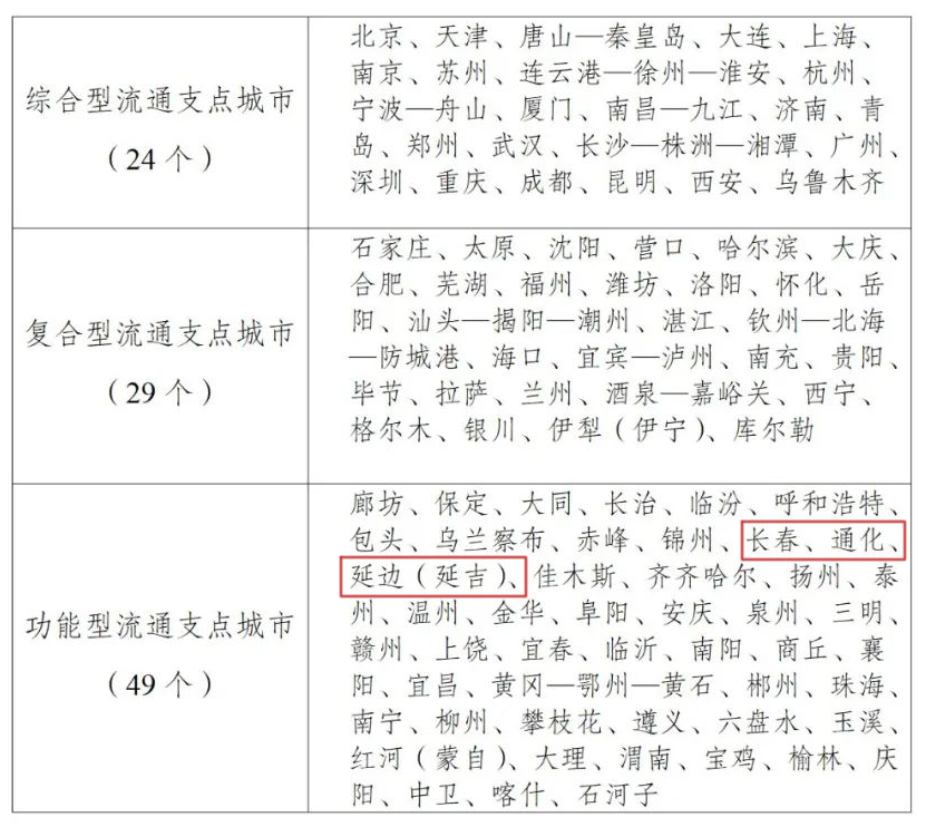 도시 자원, 발전토대, 비교우세, 미래 발전예비를 종합하여 102개 도시를 포석 건설 범위에 망라시켰다. 지점도시는 전국 31개 성과 자치구, 직할시, 신강생산건설병퇀을 전부 망라했다. 류통 지점도시는 종합형, 복합형, 기능형 분류에 따라 건설을 추진하게 되며 도시 인민정부는 주체 작용을 발휘하여 자체 발전수준을 제고하고 복사 견인작용을 증강하게 된다.