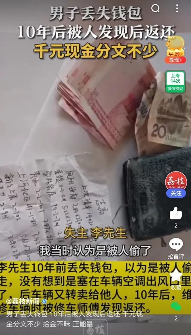 2-3년이 지나 리선생은 승용차를 친구 리빈에게 팔았다. 두사람은 평소 별다른 왕래가 없었다. 며칠전 리선생은 리빈의 전화를 받고 리빈의 집을 찾아갔다. 리빈이 넘겨주는 지저분해진 돈지갑을 보고서야 10년전 분실한 돈지갑이 떠올랐다.