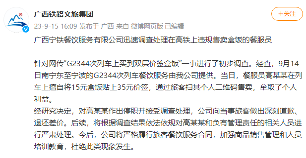 광서철도 문화관광그룹이 9월 15일 “G2344 렬차편에서 가격표가 두개 겹친 도시락을 구매했다”는 인터넷소문에 대해 조사를 진행한후 통보를 냈다. 통보에 따르면 9월 14일 남녕동-녕파구간 G2344 렬차편에서 렬차 봉사인원 고모모가 정가 15원 도시락에 35원 가격표를 붙이고 QR코드 스캔방식으로 판매해 사리를 챙겼다.