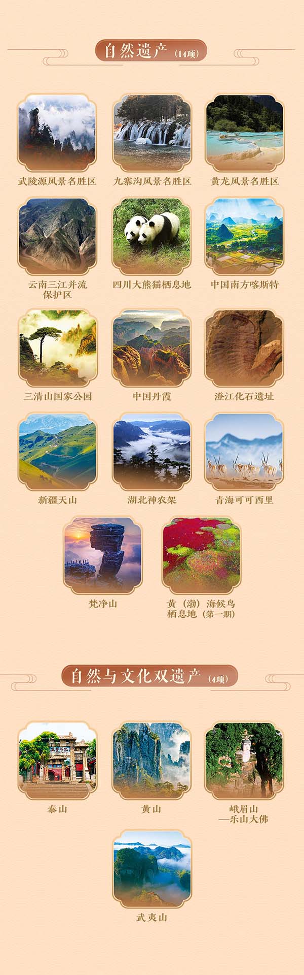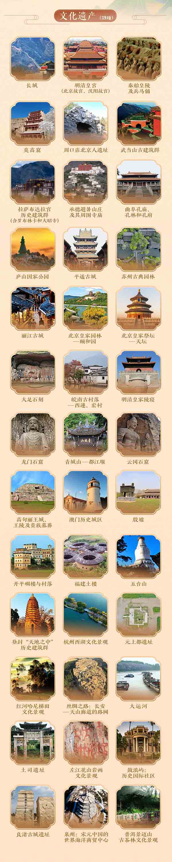 최근 중국 ‘보이 경매산 고차숲문화경관’이 <유네스코명부>에 등재되면서 전세계에서 차를 주제로 한 첫번째 세계문화유산이 되였다. 이로써 우리 나라의 세계유산수는 57개로 증가했는데 그중 문화유산이 39개이고 자연유산이 14개이며 자연과 문화 이중유산이 4개에 달했다. 우리 나라는 수효가 가장 많고 종류가 가장 다양하며 내포가 가장 풍부한 문화유산을 갖고 있는데 당신은 어떤 곳을 가장 가보고 싶은가? 이번 국경절 휴가기간 배치해보자!
