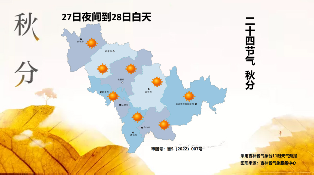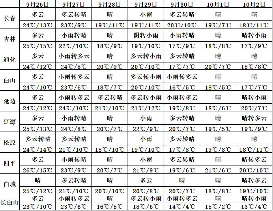 이번 주(9월 25일-10월 1일) 길림성 평균기온은 14.0℃ 안팎으로 평년보다 조금 높겠다. 길림성 평균강수량은 6.0밀리메터 좌우로 평년보다 조금 적겠다. 25일 중동부 대부분 지역에는 적은 비가 내리겠고 27일 중동부에 적은 비가 내리겠으며 29일-30일 중북부에는 중등 정도의 비가 내리겠고 기타 지역에는 적은비가 내리겠다. 이번 주 기온의 단계변화가 뚜렷하겠는데 25일-27일 기온이 오르다가 28일부터 떨어지겠다.