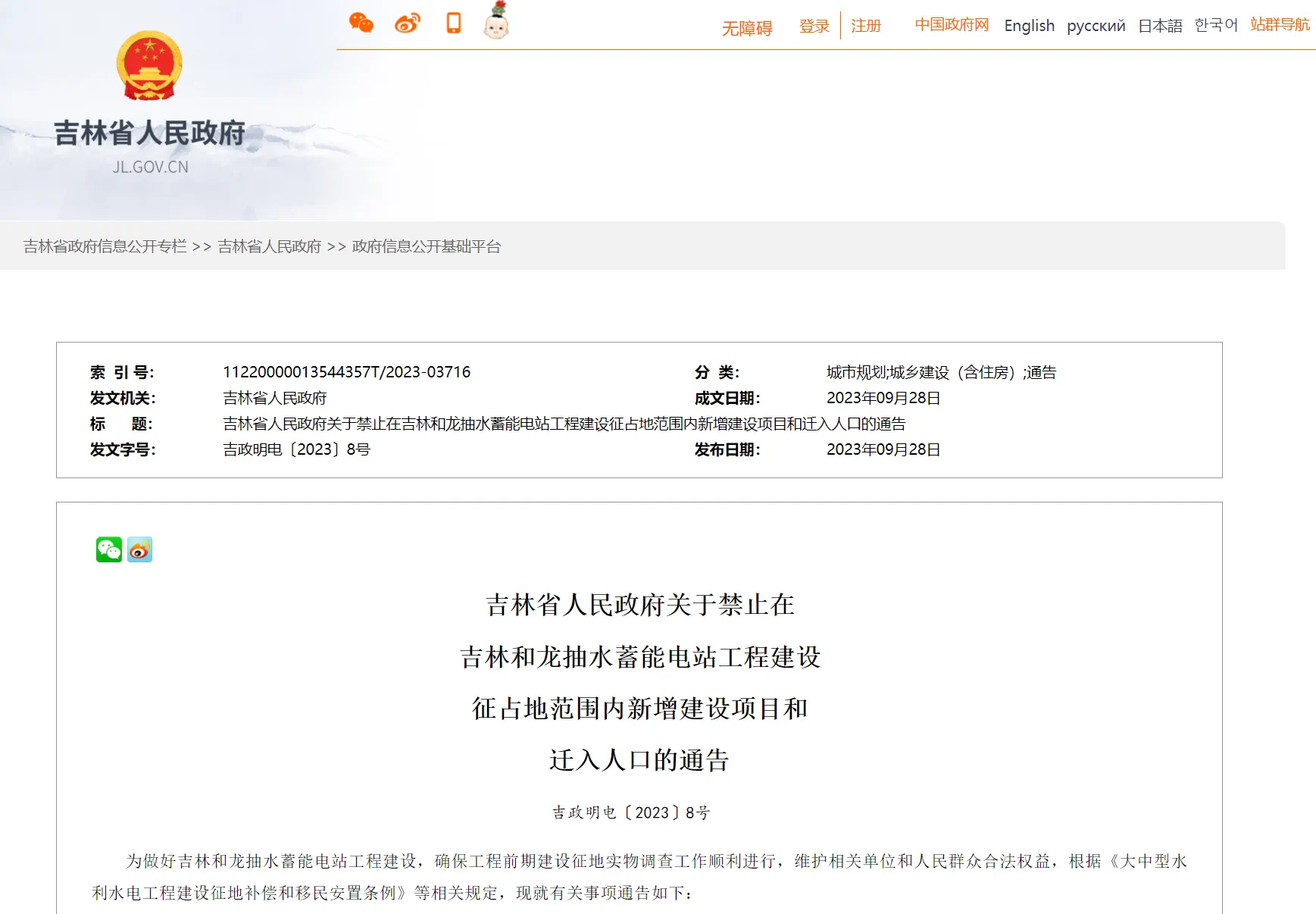 길림화룡양수에너지축적발전소공사건설 부지징용범위내 신규건설대상 및 인구전입 금지에 관한 길림성인민정부 통고