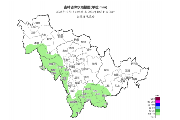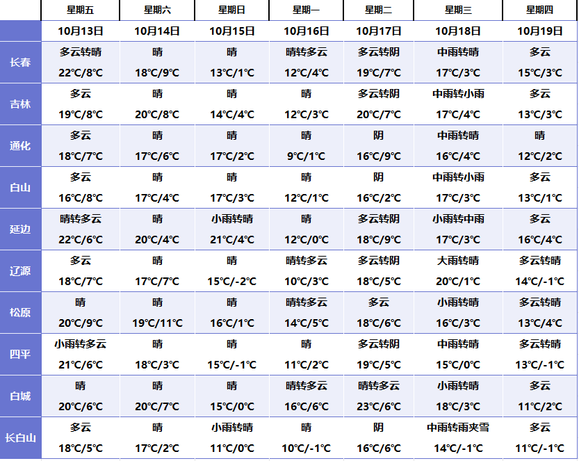 향후 일주일간(10월 13일-19일), 길림성 평균기온은 8.0℃ 안팎으로 평년 동기보다 6.9℃ 높을 것으로 예상된다. 평균 강수량은 5.0밀리메터 안팎으로 평년 동기보다 5.6밀리메터 적을 것으로 예상된다.