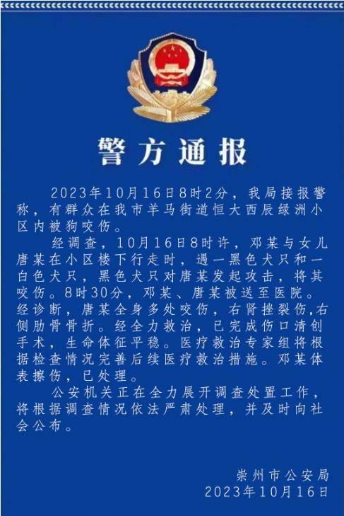 숭주시공안국은 16일 오후 개에게 물린 녀아는 온몸에 여러 곳이 물리고 오른쪽 신장에 파렬상이 있으며 오른쪽 갈비뼈가 부러졌다고 통보했다. 최선을 다해 치료한 결과 현재 상처처치수술이 완료되였으며 생명징후가 안정적이다. 의료 전문가팀은 검사 상황에 따라 후속 의료조치를 개선하게 된다.