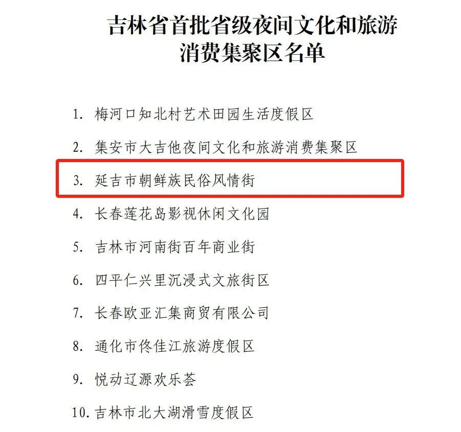 길림성 제1진 성급 야간문화 및 관광소비 집결구 명단이 공포됐다. 도합 10개 단위가 입선된 가운데 연변주에서는 1개 단위가 명단에 올랐다.