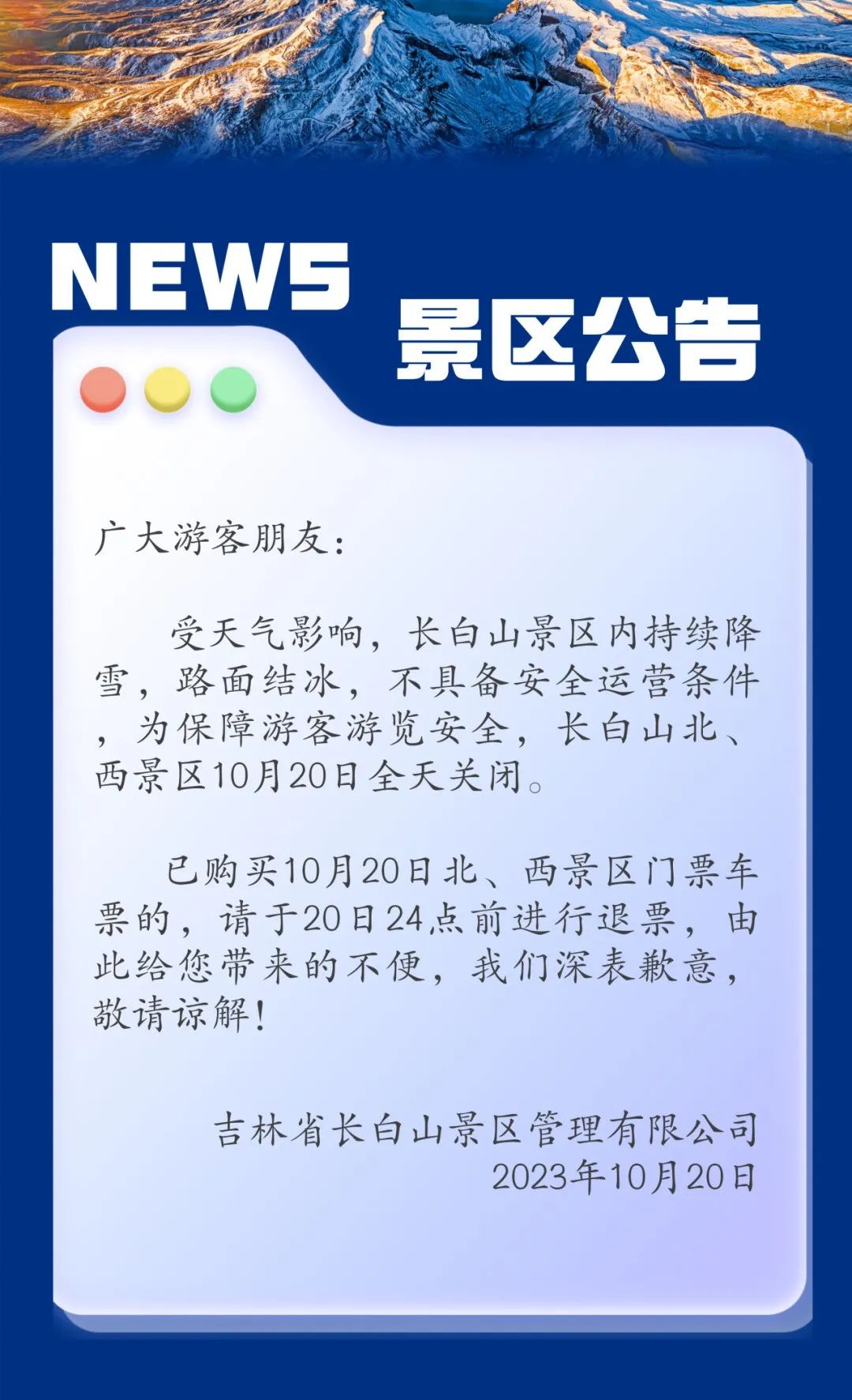 날씨 영향으로 장백산풍경구내에 지속적으로 눈이 내려 도로가 결빙되였으며 안전운영조건을 구비하지 못하게 되였다. 관광객들의 안전을 보장하고저 장백산 북, 서 풍경구는 10월 20일에 페쇄한다.