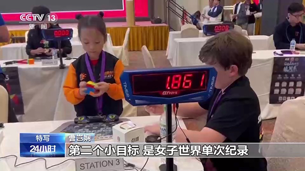 며칠전 세계큐브협회가 개최한 큐브국제오픈경기에서 강소 해안의 한 6세 소녀 조기한이 경기하는 장면이다. 손가락이 빠르게 움직이면서 큐브가 돌아가고 있다. 규칙에 따라 5라운드까지 겨룬뒤 최고와 최저점을 제외한 나머지 3번의 기록을 평균한 5초97의 성적으로 조기한은 우승을 거머쥐였다. 우승은 물론 3단계 큐브 녀자 세계기록까지 갈아치우며 세계 녀자선수로는 성적이 유일하게 평균 6초 이내에 진입한 선수가 되였다.