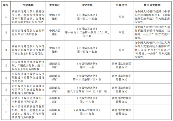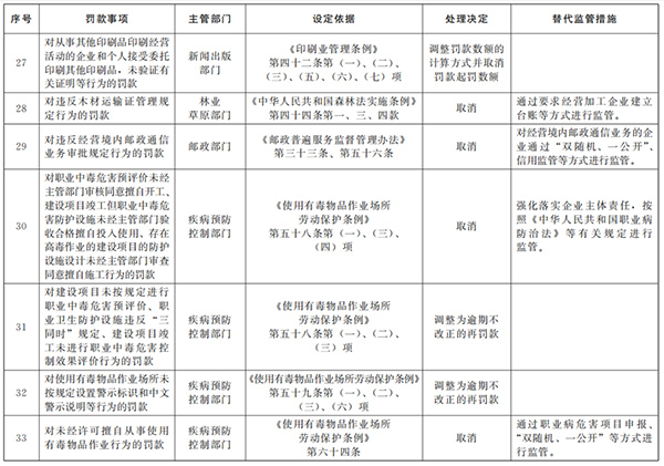 경영환경을 진일보 최적화하기 위해 국무원은 행정법규 및 부서 규칙중 벌금사항을 정리할 데 관한 사업을 전개했다. 주택 도시와 농촌 건설 등 분야의16가지 벌금사항을 취소하고 산업 및 정보화 분야에서 17개의 벌금사항을 조정하기로 결정했다. 벌금 취소사항은 이번 결정을 인쇄발부한 날부터 시작해 행정법규와 부문규정중 해당 벌금규정을 잠정중단한다. 벌금 조정사항은 수정후 해당 행정법규와 부문규정중 관련 벌금규정에 따라 집행한다.