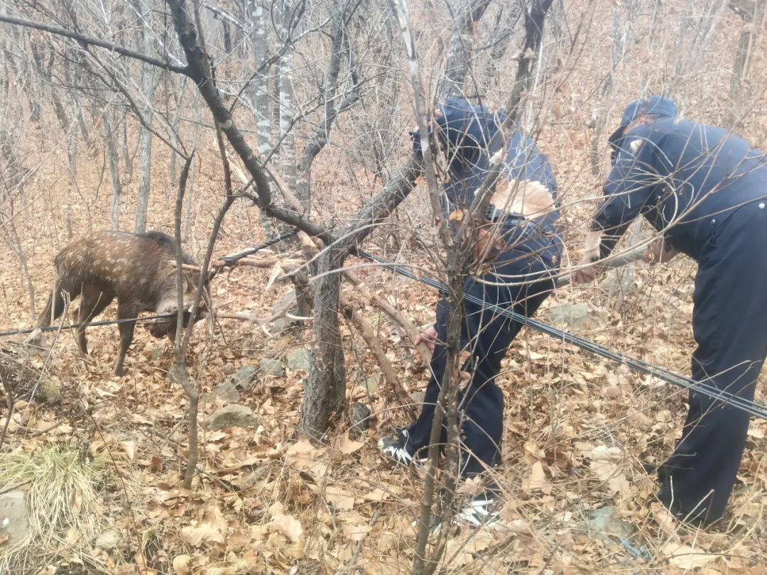 5일 훈춘삼림공안분국 삼도구파출소 민경들은 마적달변경파출소로부터 전화를 받았는데 훈춘시 하다문향 농평촌의 한 촌민의 뒤뜨락에서 대형 야생동물이 전기줄에 걸려 위험에 처해있다는 내용이였다. 민경들은 즉각 해당 상황을 관리보호소파출소에 반영함과 동시에 치안대대 민경들과 함께 현장에 출동했다.
