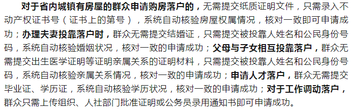 이상 5가지 호구이전업무 전과정은 길림성 군중 본인이 제출한 신청서만 접수되며 모두 도시지역 호구착지여야 한다. 군중 신청이 성공한 후 공안기관은 2개 근무일내에 처리하게 된다.