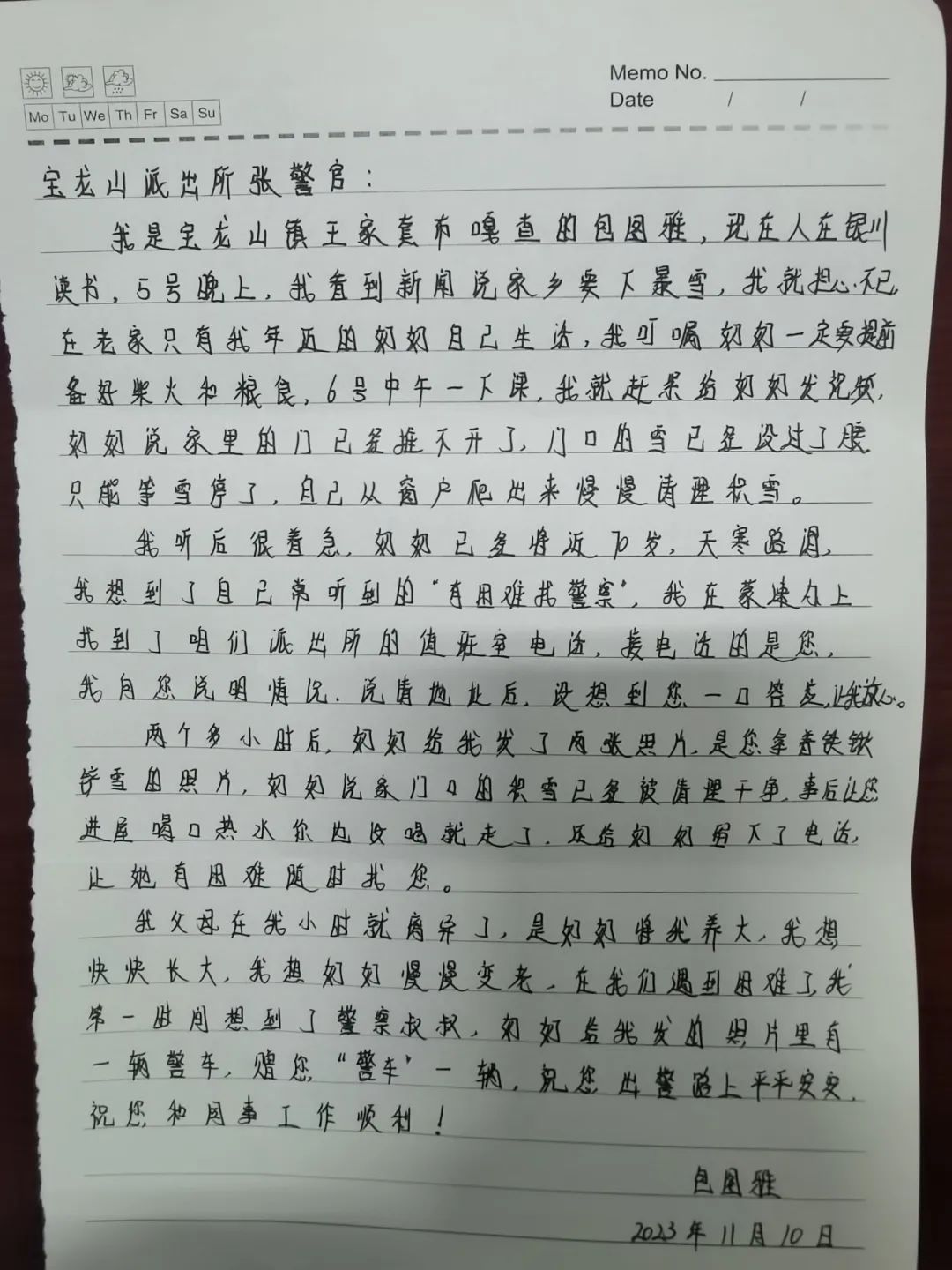 장조뢰와 동료들에게 감사편지 한통과