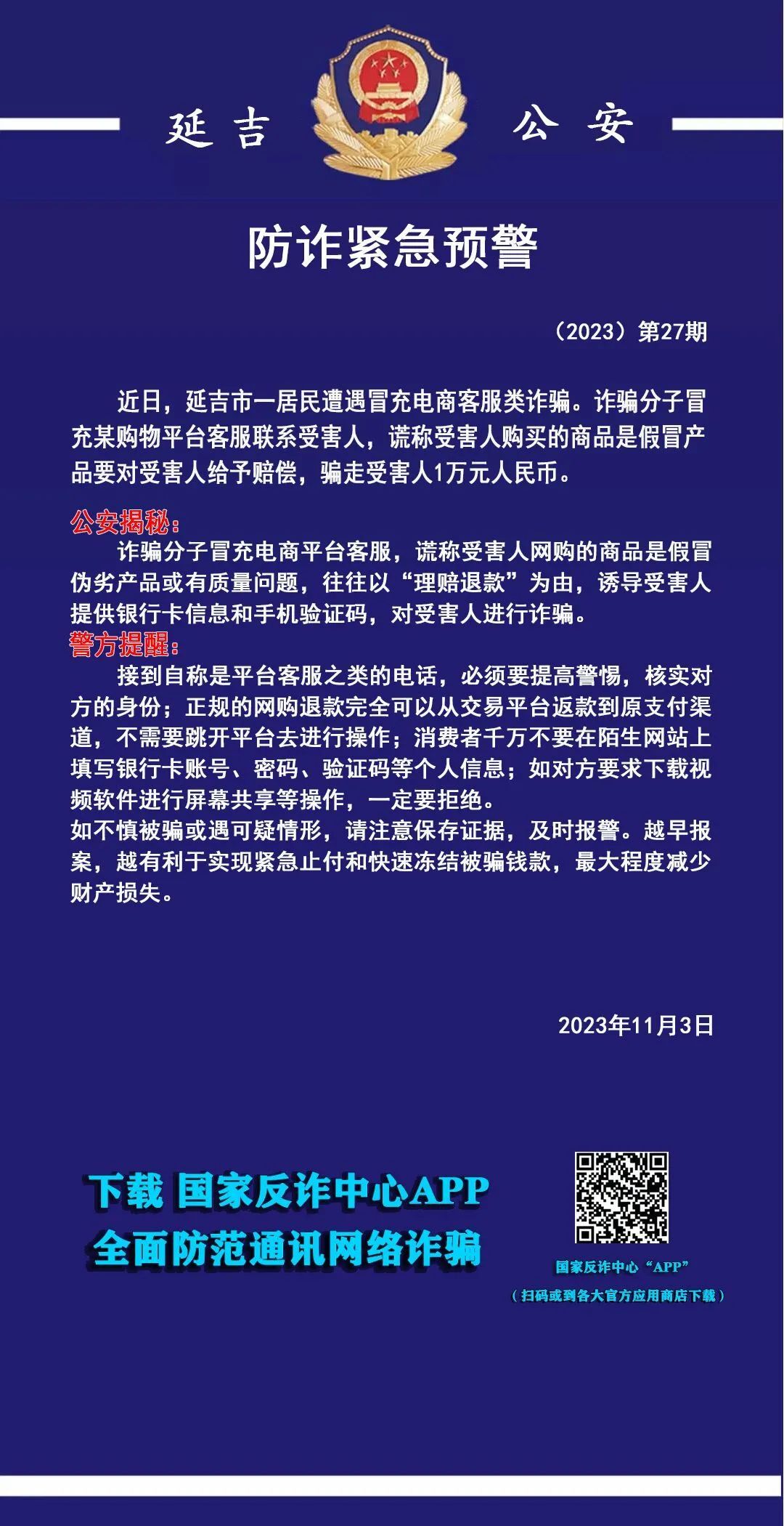 사기군은 전자상거래 플랫폼의 고객서비스를 사칭해 피해자가 인터넷에서 구입한 제품이 가짜제품이거나 품질에 문제가 있어 '배상 환불'해주겠다고 하면서 피해자가 은행카드 정보와 핸드폰 인증코드를 제공하도록 유도한 후 피해자한테서 사기를 친다.